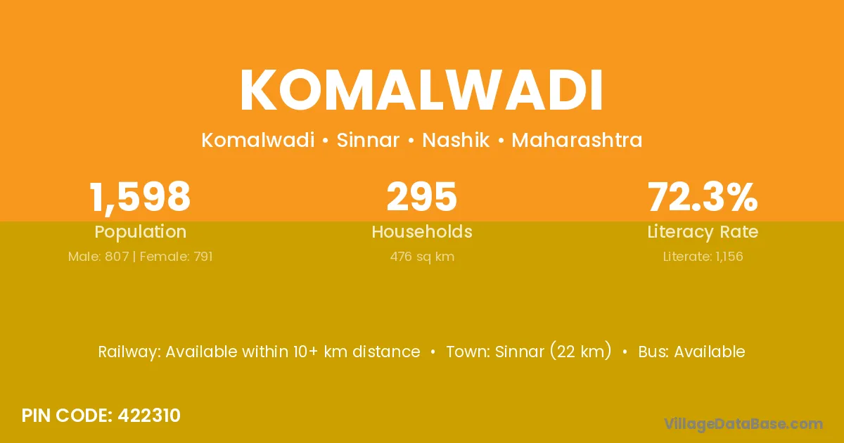 Sinnar (22 km) is the nearest town to Komalwadi village for major economic activities and is located approximately 22 km away.