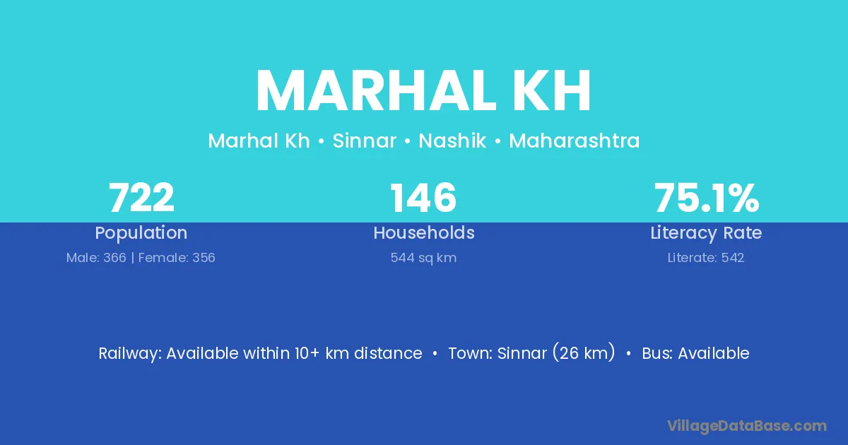 Sinnar (26 km) is the nearest town to Marhal Kh village for major economic activities and is located approximately 26 km away.