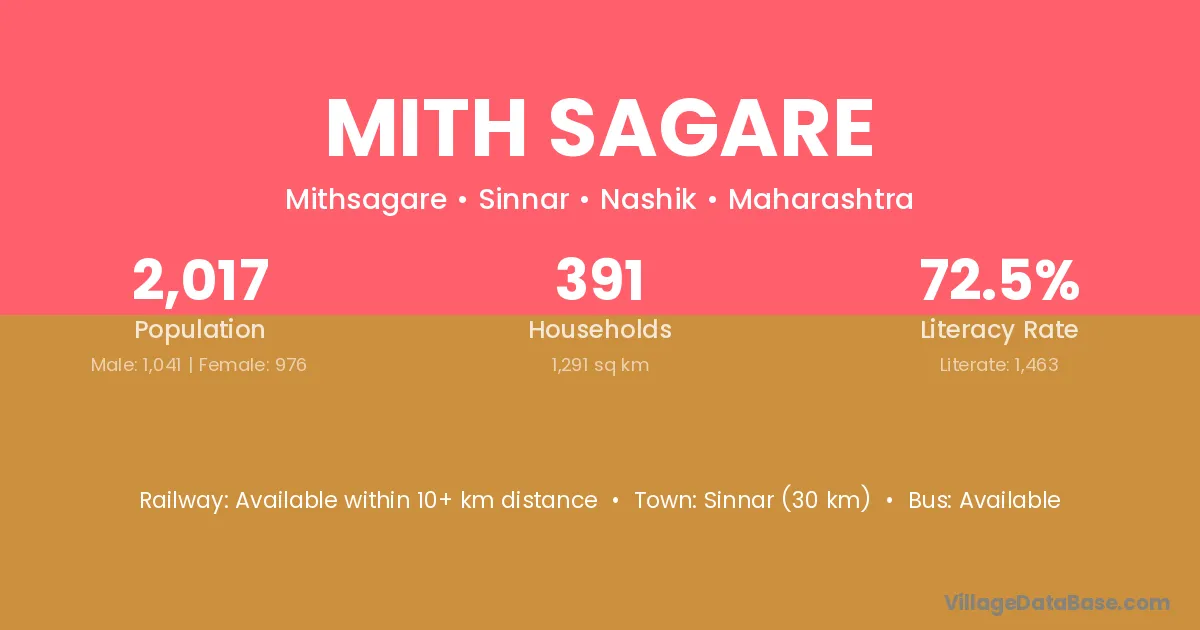 Sinnar (30 km) is the nearest town to Mith Sagare village for major economic activities and is located approximately 30 km away.