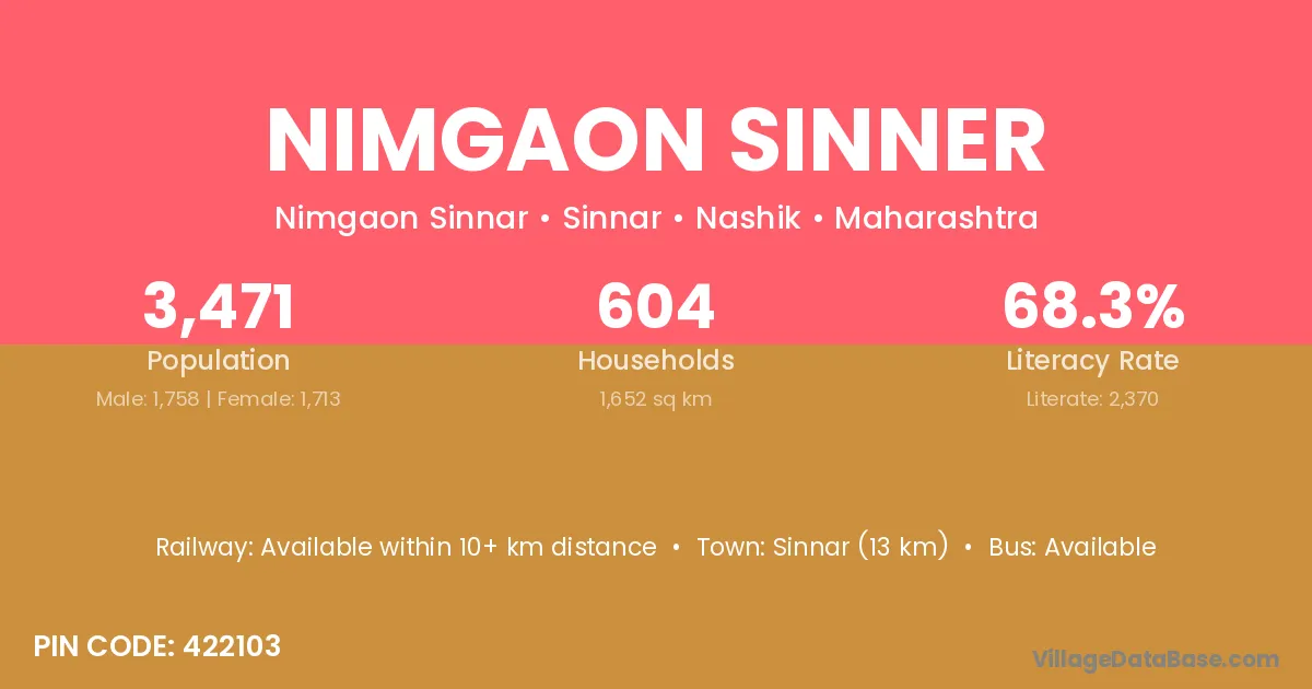 Sinnar (13 km) is the nearest town to Nimgaon Sinner village for major economic activities and is located approximately 13 km away.