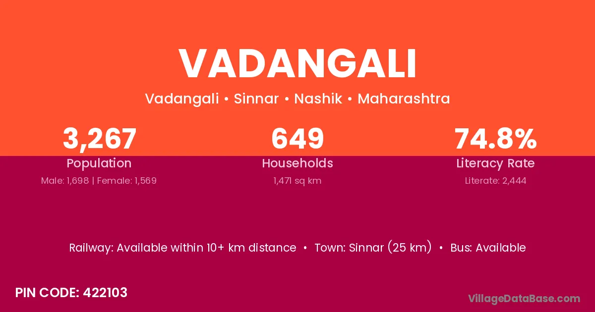 Sinnar (25 km) is the nearest town to Vadangali village for major economic activities and is located approximately 25 km away.