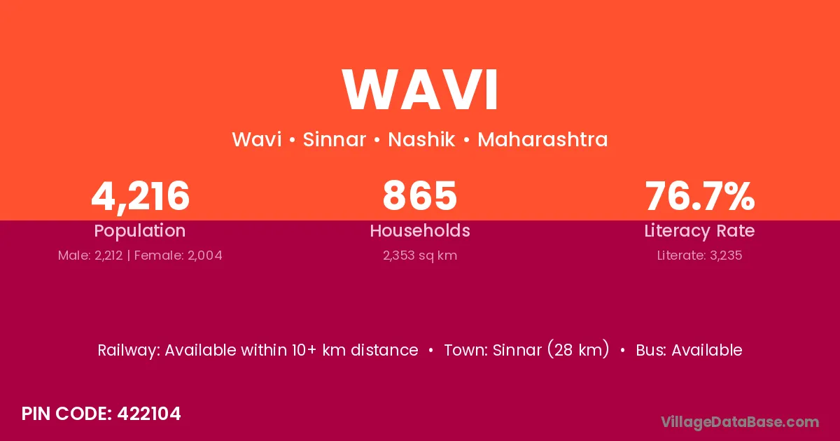 Sinnar (28 km) is the nearest town to Wavi village for major economic activities and is located approximately 28 km away.