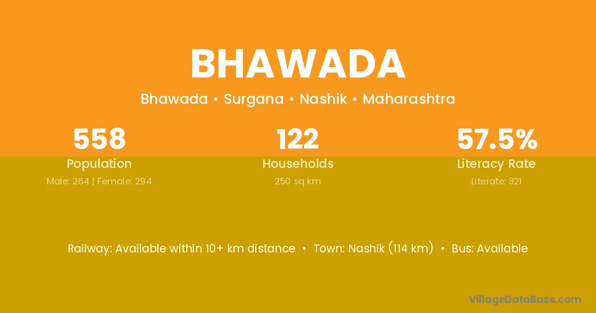 Nashik (114 km) is the nearest town to Bhawada village for major economic activities and is located approximately 114 km away.