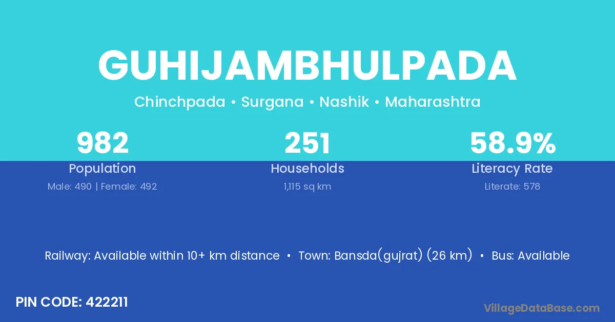 Bansda(gujrat) (26 km) is the nearest town to Guhijambhulpada village for major economic activities and is located approximately 26 km away.