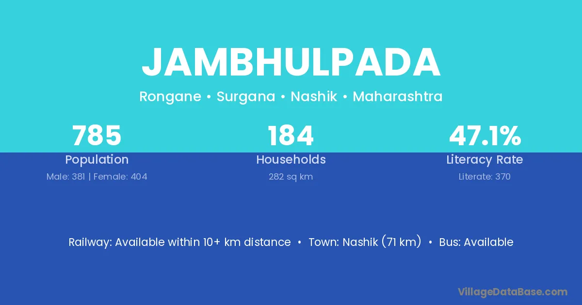 Jambhulpada village has a total population of 785 people, of which 381 are males and 404 are females.