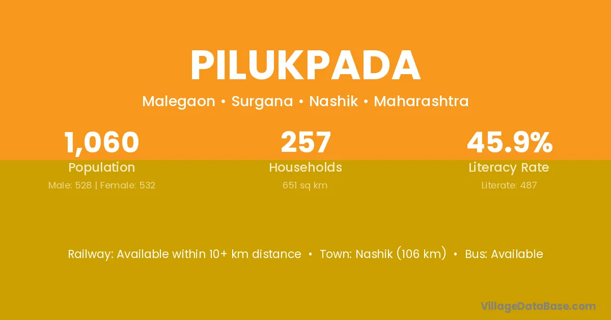 Nashik (106 km) is the nearest town to Pilukpada village for major economic activities and is located approximately 106 km away.