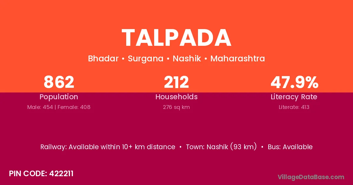 Nashik (93 km) is the nearest town to Talpada village for major economic activities and is located approximately 93 km away.