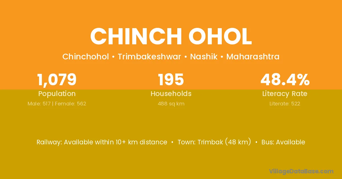 Trimbak (48 km) is the nearest town to Chinch Ohol village for major economic activities and is located approximately 48 km away.