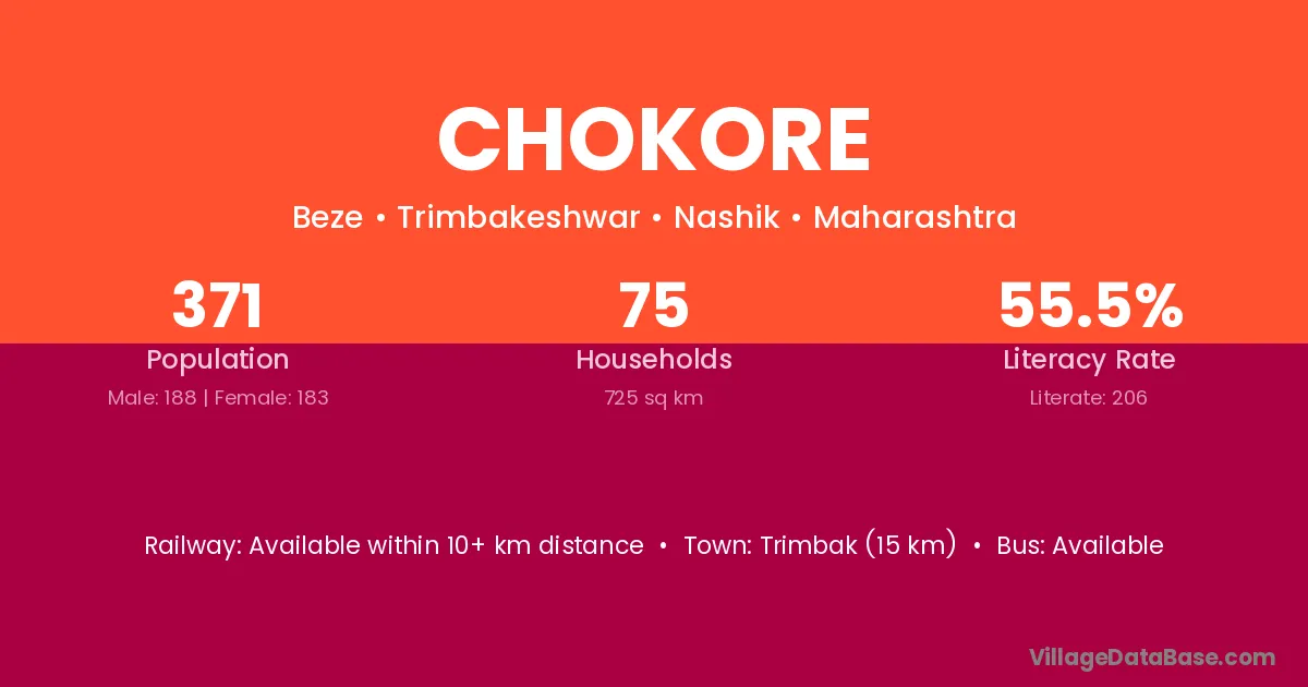 Trimbak (15 km) is the nearest town to Chokore village for major economic activities and is located approximately 15 km away.