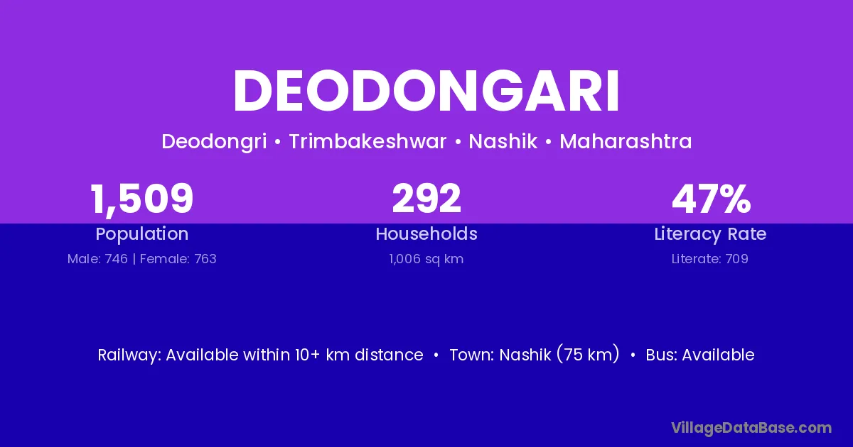 Nashik (75 km) is the nearest town to Deodongari village for major economic activities and is located approximately 75 km away.