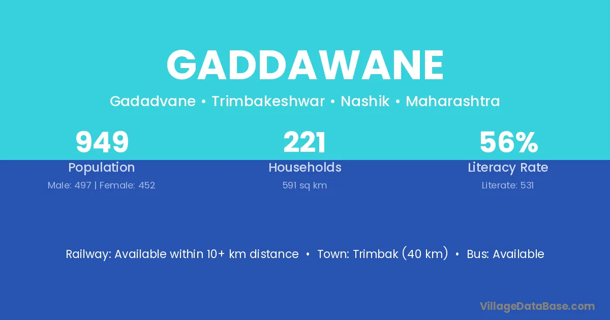 Trimbak (40 km) is the nearest town to Gaddawane village for major economic activities and is located approximately 40 km away.