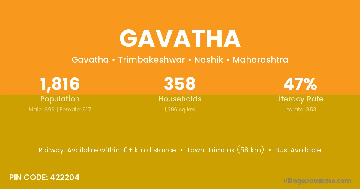 Trimbak (58 km) is the nearest town to Gavatha village for major economic activities and is located approximately 58 km away.