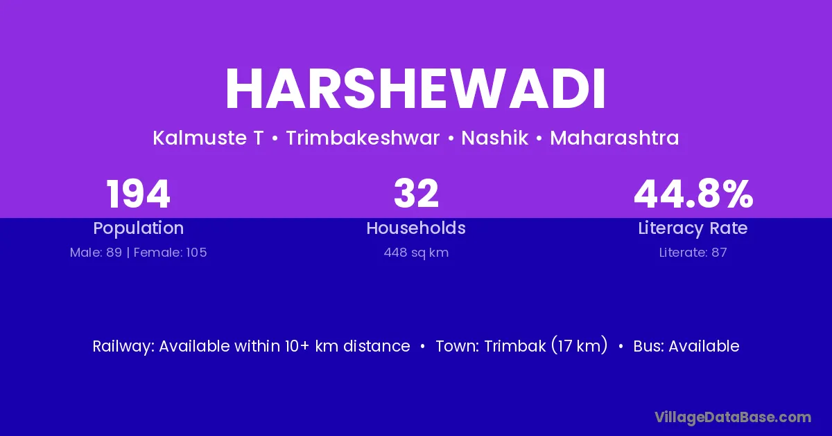 Trimbak (17 km) is the nearest town to Harshewadi village for major economic activities and is located approximately 17 km away.