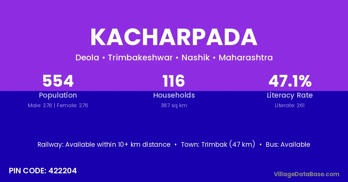 Trimbak (47 km) is the nearest town to Kacharpada village for major economic activities and is located approximately 47 km away.