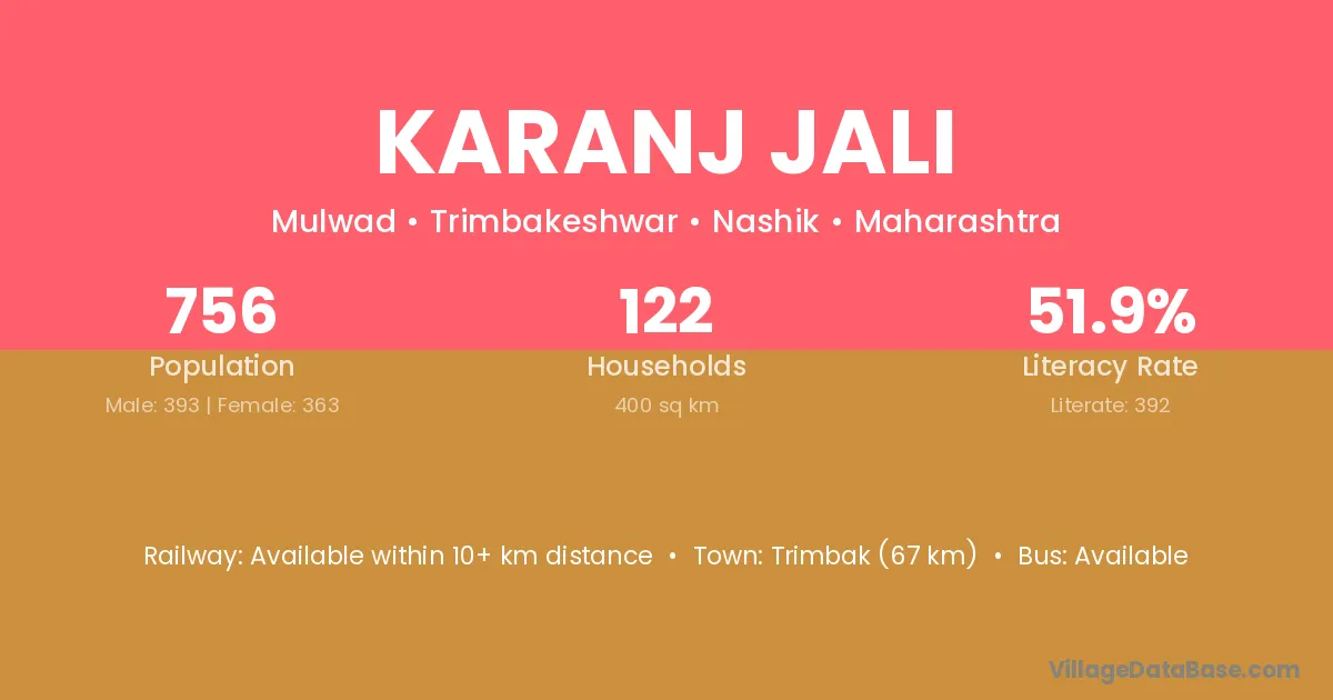 Trimbak (67 km) is the nearest town to Karanj Jali village for major economic activities and is located approximately 67 km away.