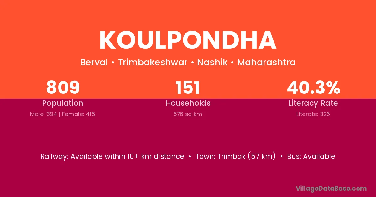 Trimbak (57 km) is the nearest town to Koulpondha village for major economic activities and is located approximately 57 km away.