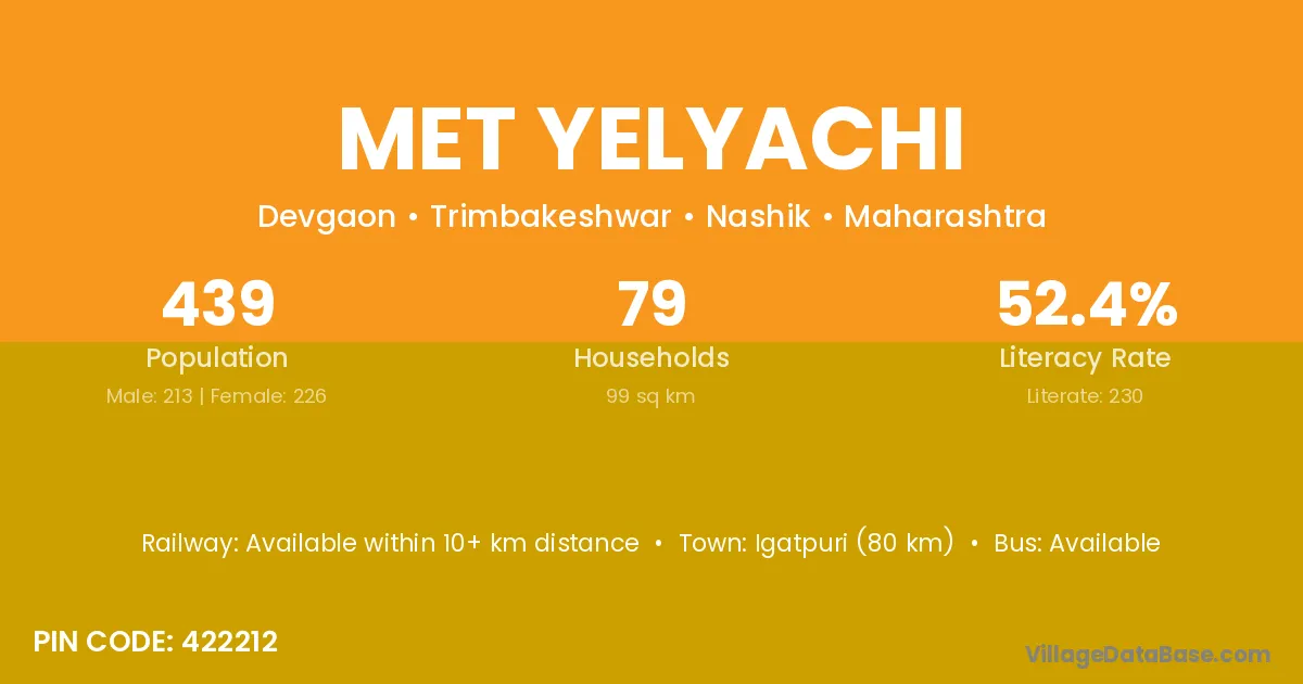 Igatpuri (80 km) is the nearest town to Met Yelyachi village for major economic activities and is located approximately 80 km away.