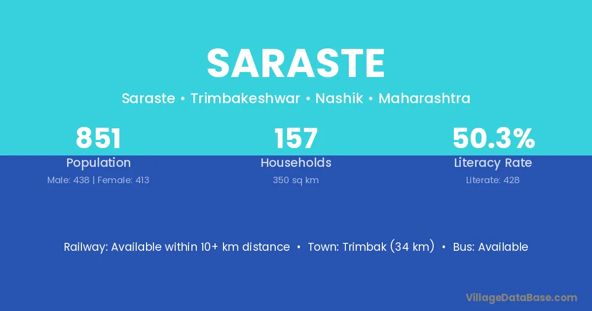 Trimbak (34 km) is the nearest town to Saraste village for major economic activities and is located approximately 34 km away.