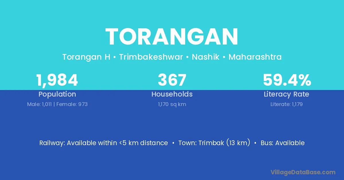 Trimbak (13 km) is the nearest town to Torangan village for major economic activities and is located approximately 13 km away.