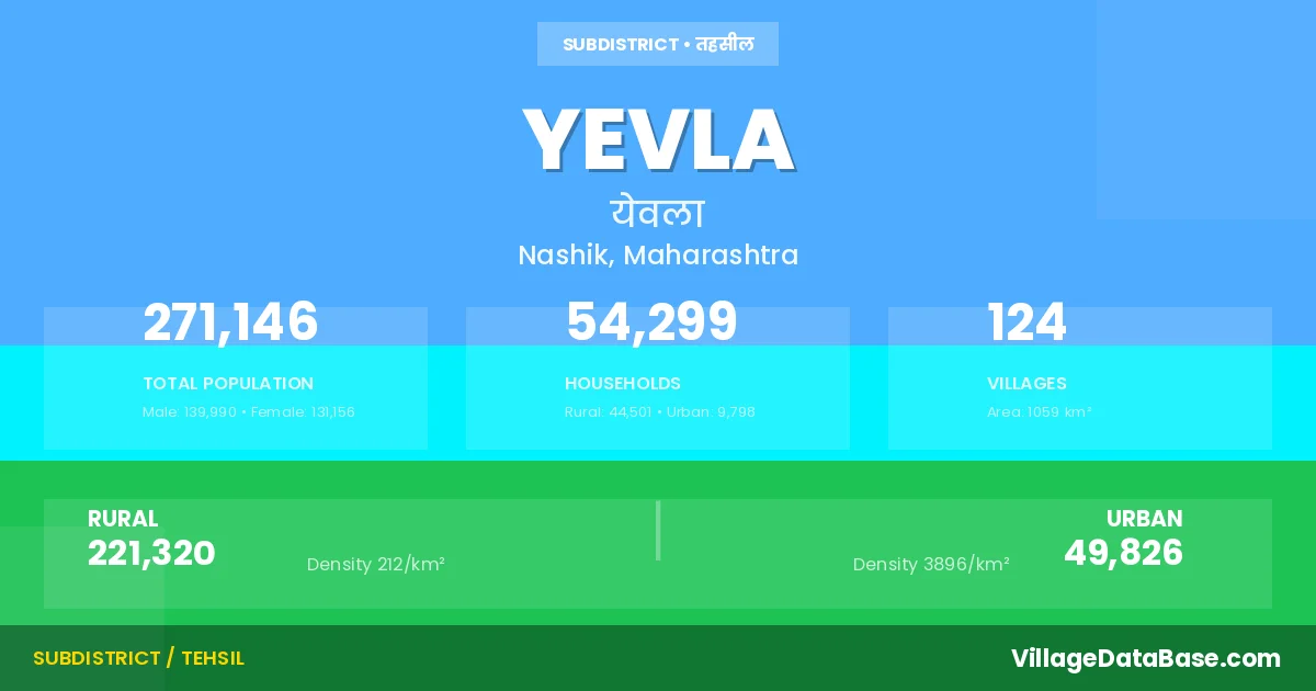 According to the 2011 census The total area of Yevla Tehsil is 1059 km², with a population of 271146 people. The population density is 256 inhabitants per square kilometre, and there are approximately 54299 houses in the sub district.