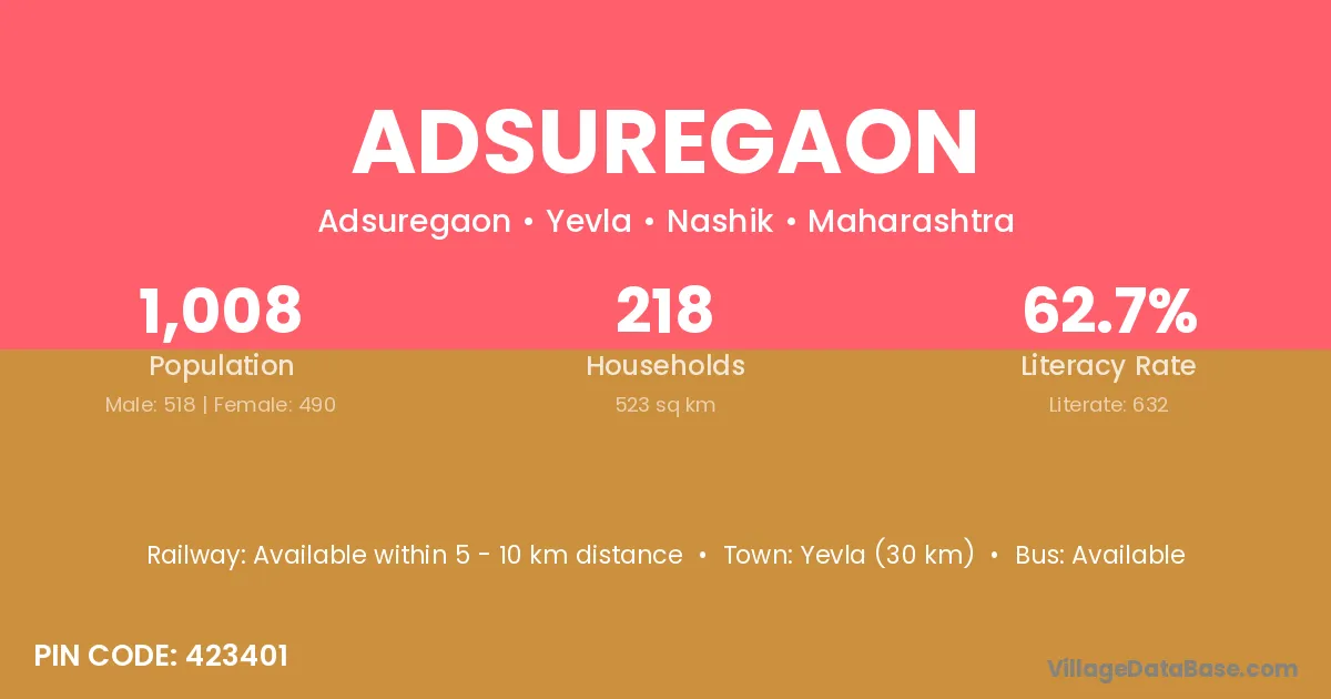 Yevla (30 km) is the nearest town to Adsuregaon village for major economic activities and is located approximately 30 km away.