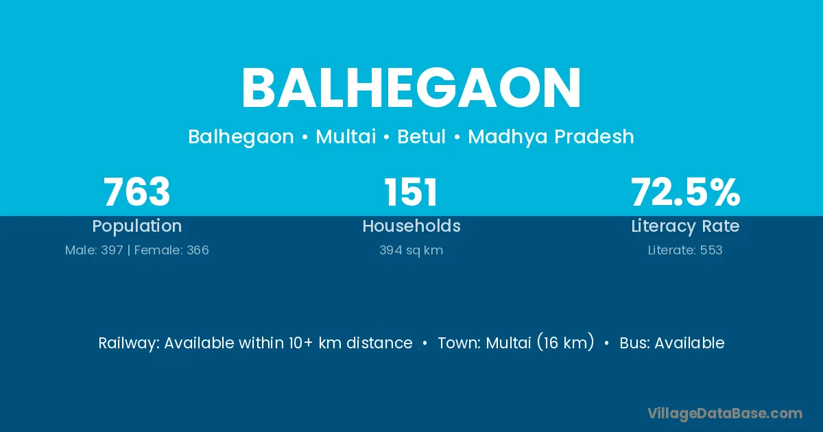 Balhegaon village has a total population of 1,686 people, of which 848 are males and 838 are females.