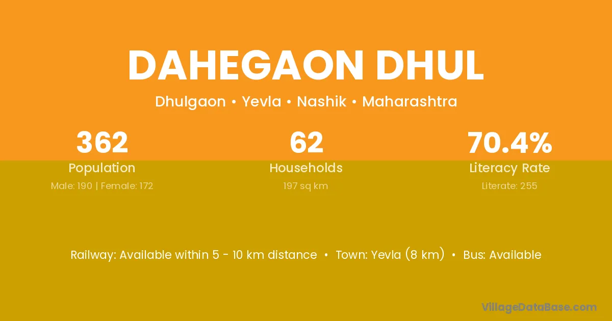 Dahegaon Dhul village has a total population of 362 people, of which 190 are males and 172 are females.