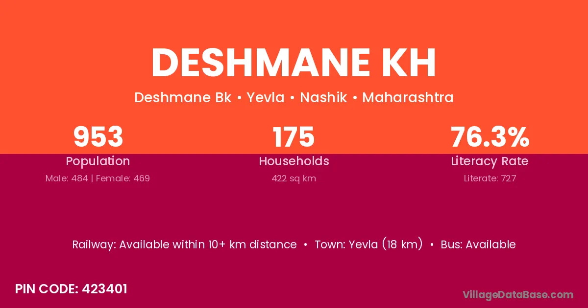 Deshmane Kh village has a total population of 953 people, of which 484 are males and 469 are females.