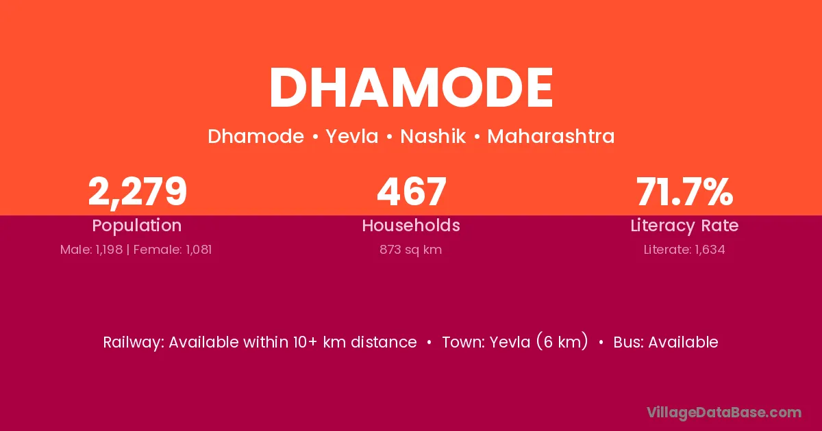 Yevla (6 km) is the nearest town to Dhamode village for major economic activities and is located approximately 6 km away.