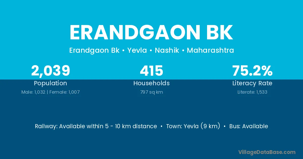 Erandgaon Bk village has a total population of 2,039 people, of which 1,032 are males and 1,007 are females.