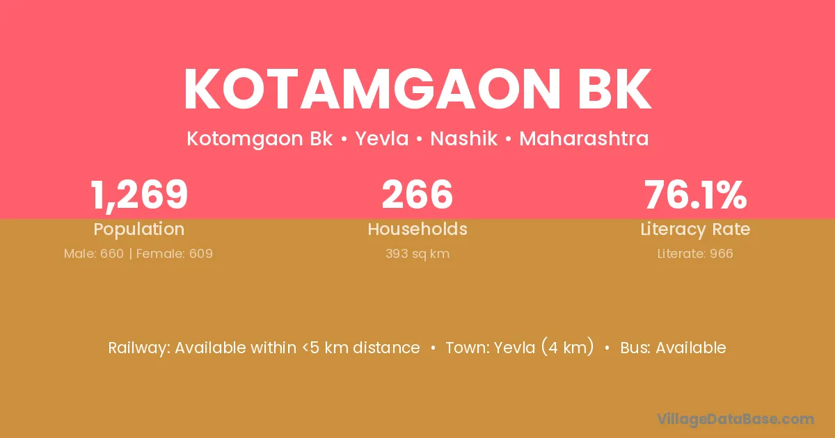Kotamgaon Bk village has a total population of 1,269 people, of which 660 are males and 609 are females.