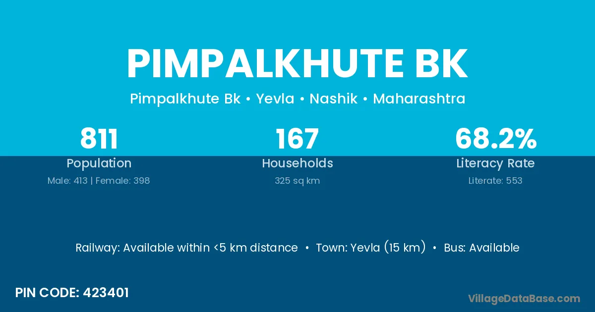 Pimpalkhute Bk village has a total population of 811 people, of which 413 are males and 398 are females.