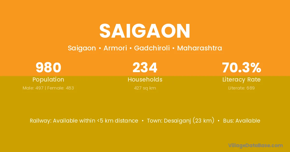 The literacy rate of Saigaon village is 72.18%. Male literacy stands at 78.69% and female literacy at 65.64%.