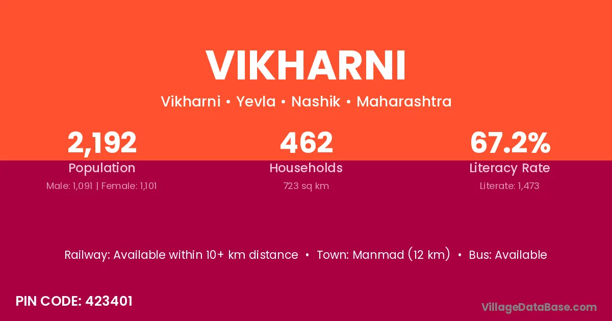 Manmad (12 km) is the nearest town to Vikharni village for major economic activities and is located approximately 12 km away.