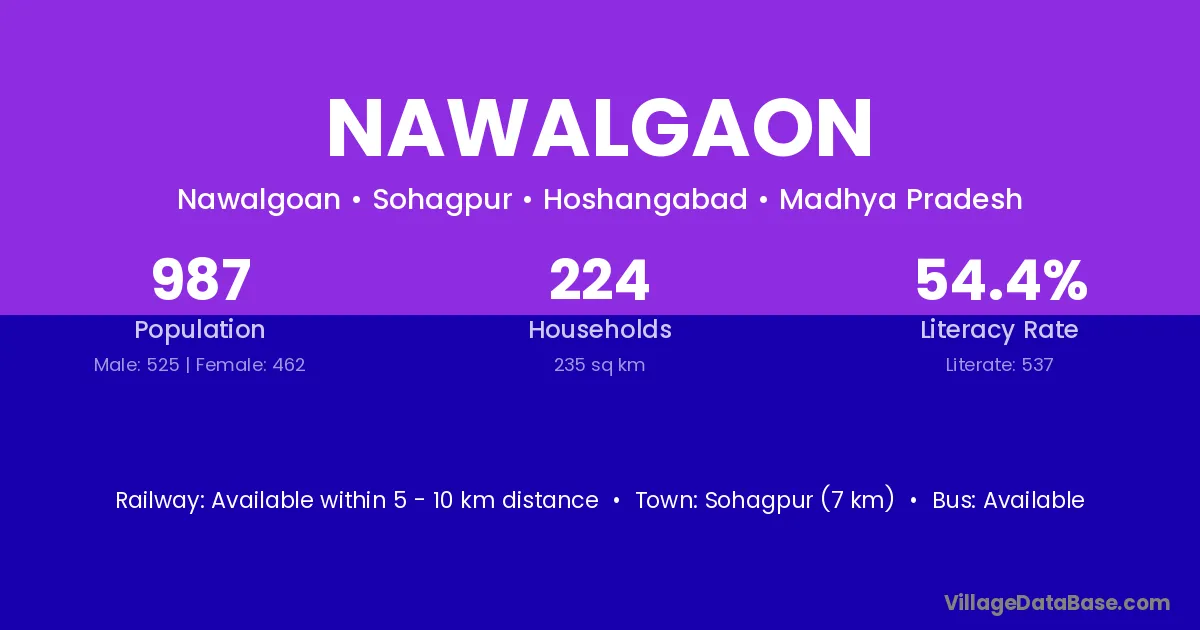 Bhum (52 km) is the nearest town to Nawalgaon village for major economic activities and is located approximately 52 km away.