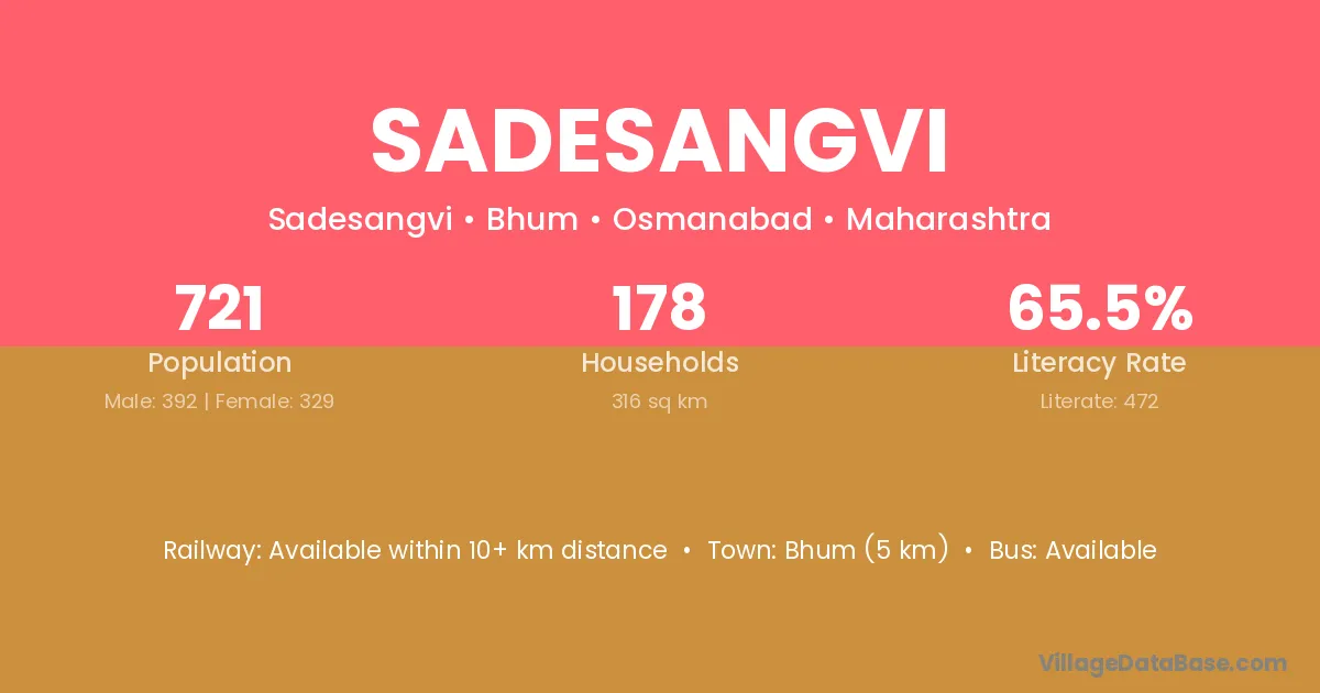 Bhum (5 km) is the nearest town to Sadesangvi village for major economic activities and is located approximately 5 km away.