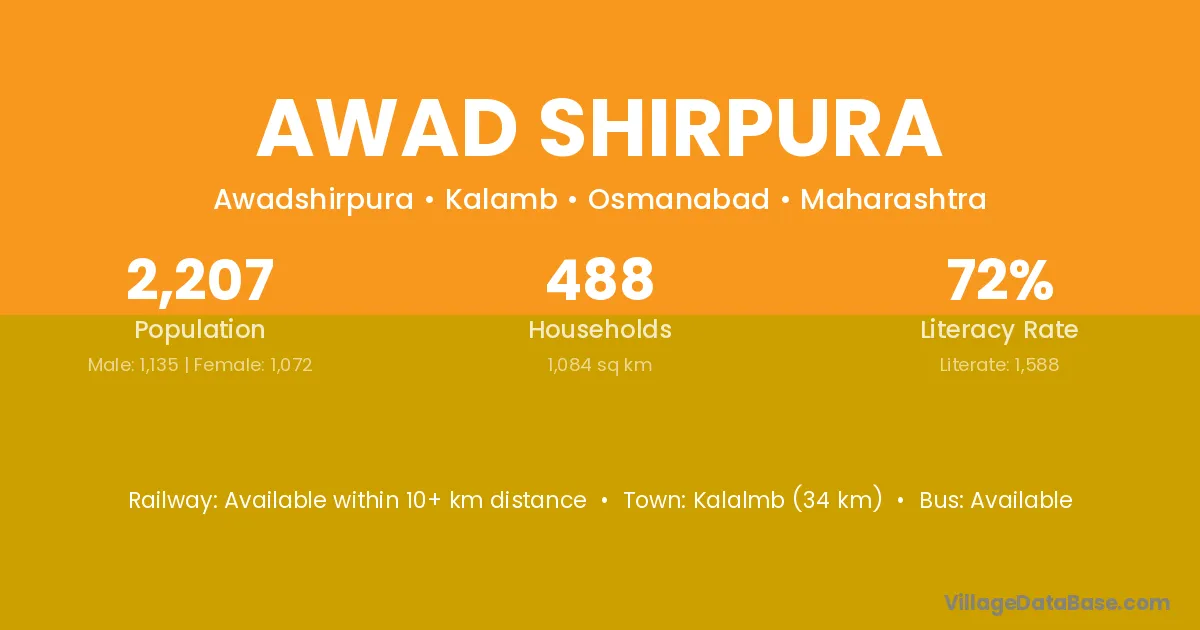 Awad Shirpura village has a total population of 2,207 people, of which 1,135 are males and 1,072 are females.