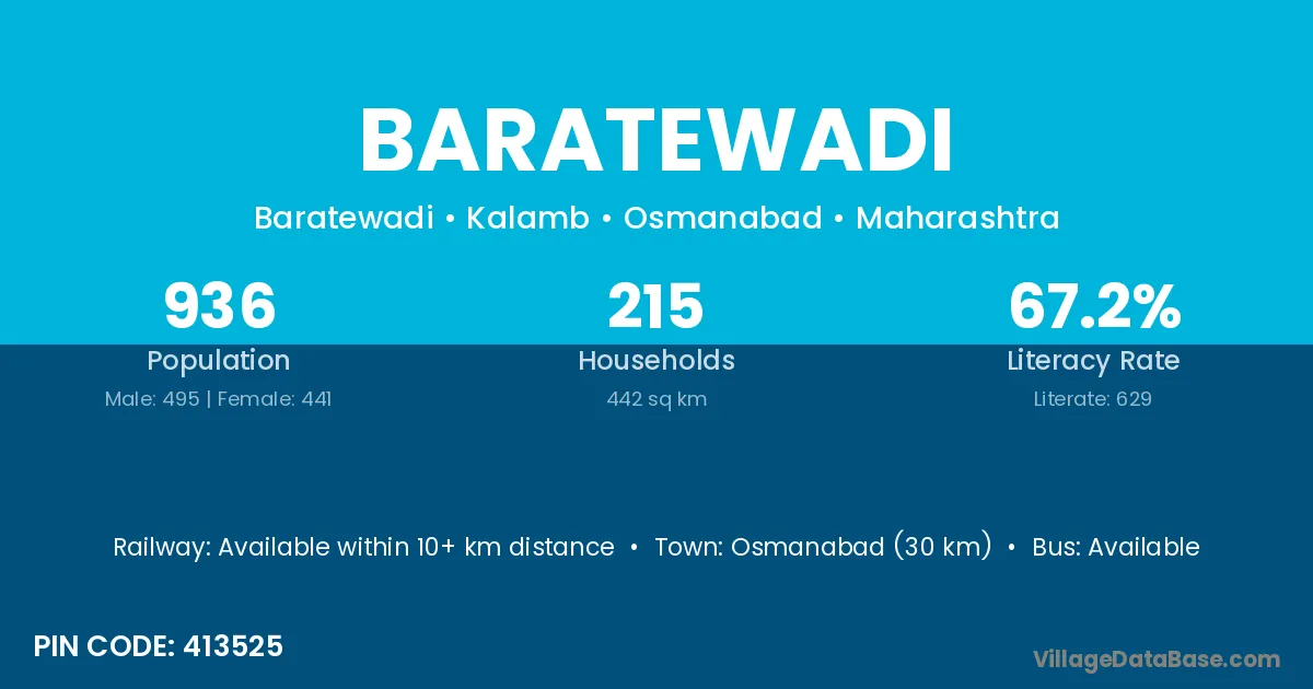 Osmanabad (30 km) is the nearest town to Baratewadi village for major economic activities and is located approximately 30 km away.