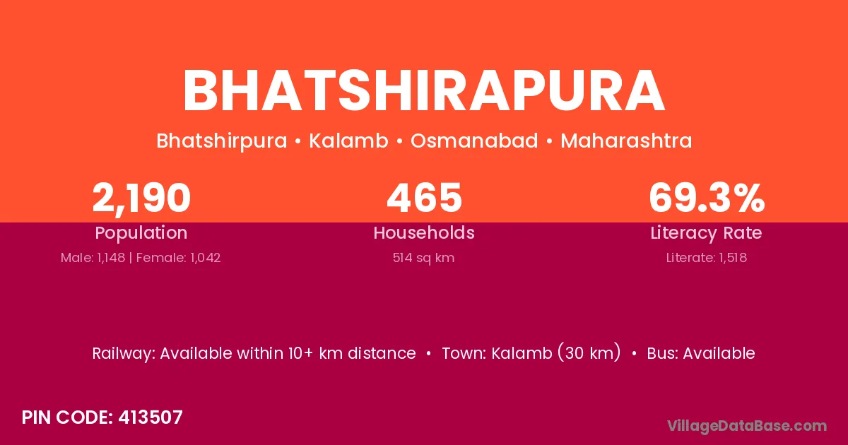 Kalamb (30 km) is the nearest town to Bhatshirapura village for major economic activities and is located approximately 30 km away.