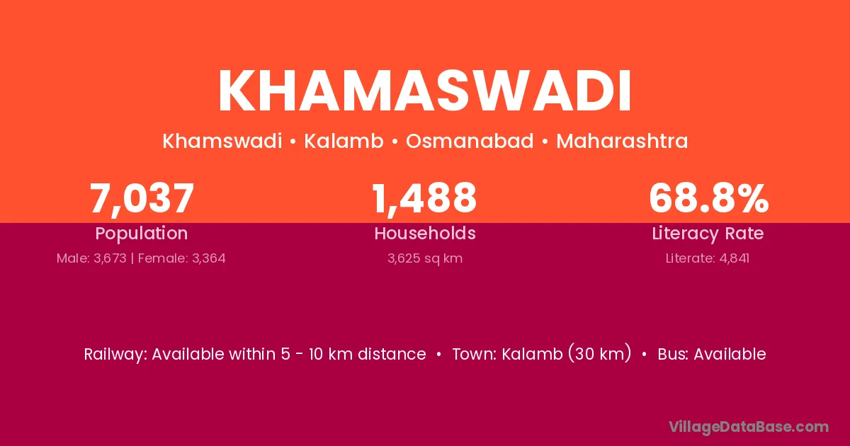 Kalamb (30 km) is the nearest town to Khamaswadi village for major economic activities and is located approximately 30 km away.