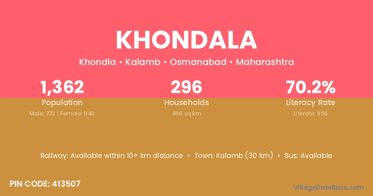 Kalamb (30 km) is the nearest town to Khondala village for major economic activities and is located approximately 30 km away.