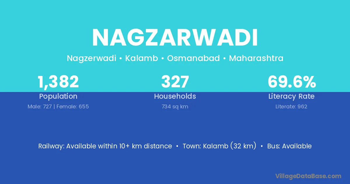 Kalamb (32 km) is the nearest town to Nagzarwadi village for major economic activities and is located approximately 32 km away.