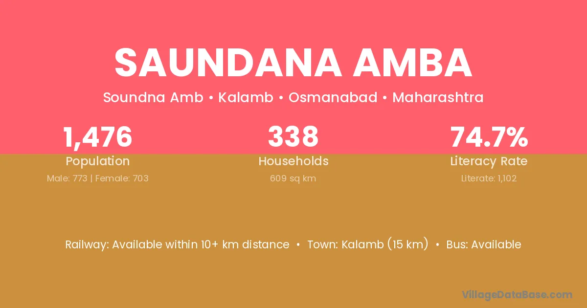 Saundana Amba village has a total population of 1,476 people, of which 773 are males and 703 are females.