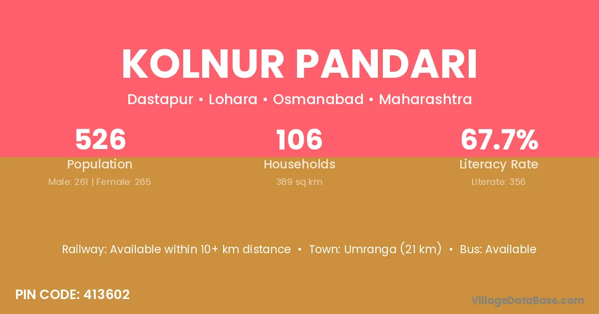 Umranga (21 km) is the nearest town to Kolnur Pandari village for major economic activities and is located approximately 21 km away.