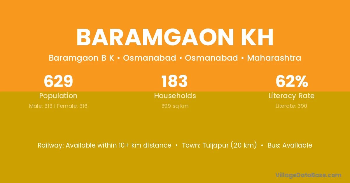Tuljapur (20 km) is the nearest town to Baramgaon Kh village for major economic activities and is located approximately 20 km away.