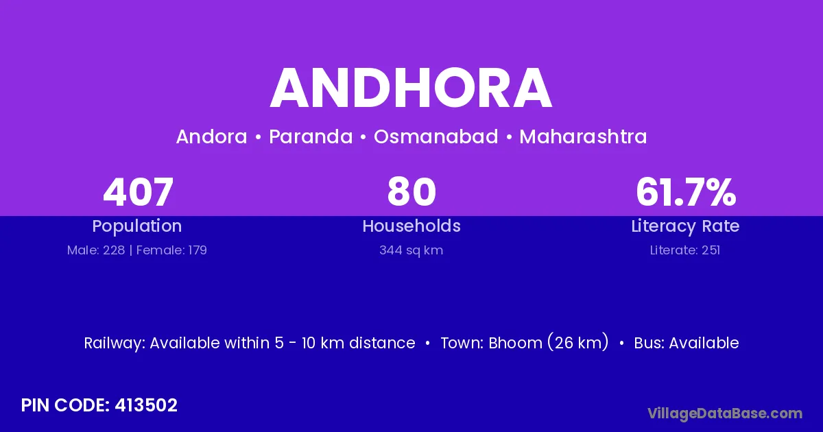 Bhoom (26 km) is the nearest town to Andhora village for major economic activities and is located approximately 26 km away.
