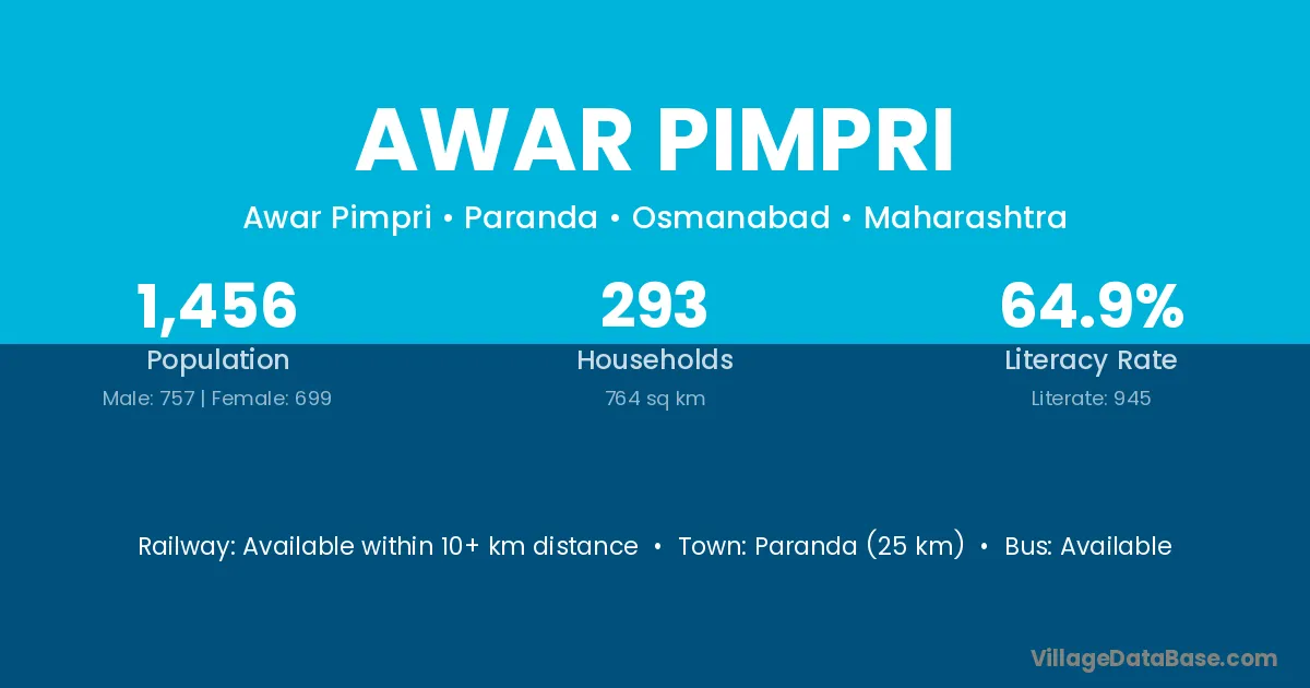 Paranda (25 km) is the nearest town to Awar Pimpri village for major economic activities and is located approximately 25 km away.
