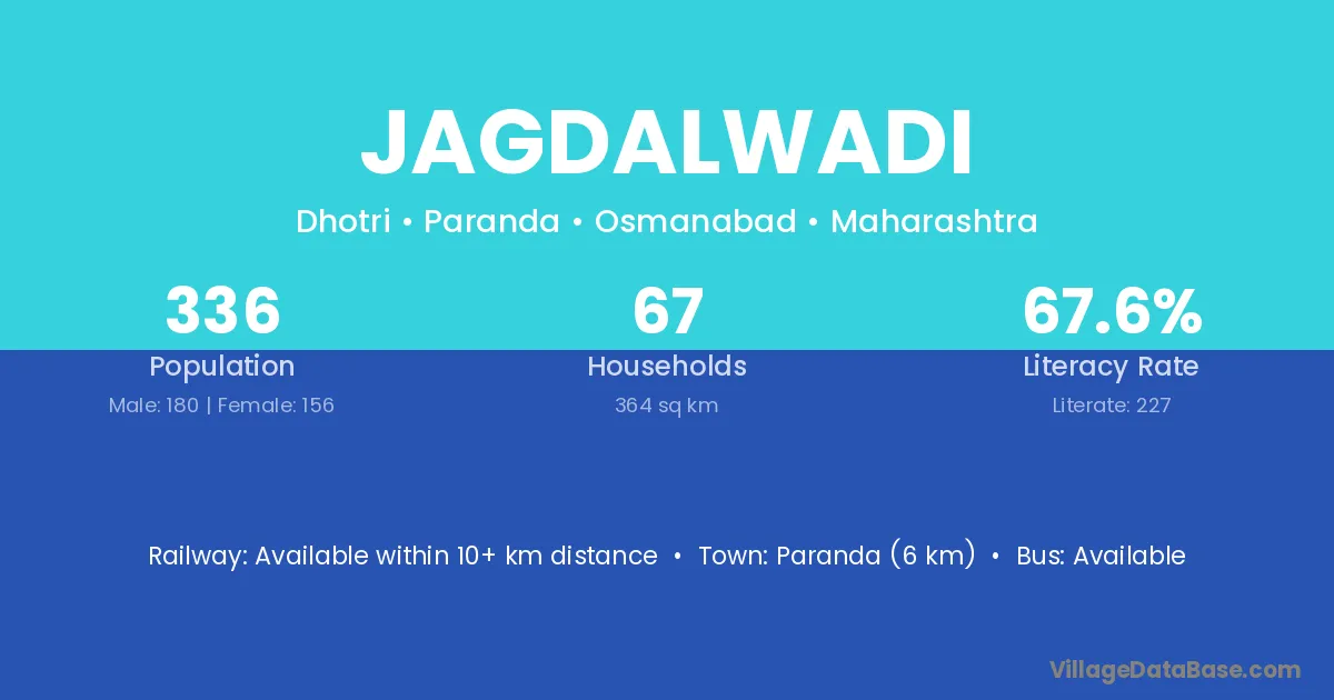 Jagdalwadi village has a total population of 336 people, of which 180 are males and 156 are females.