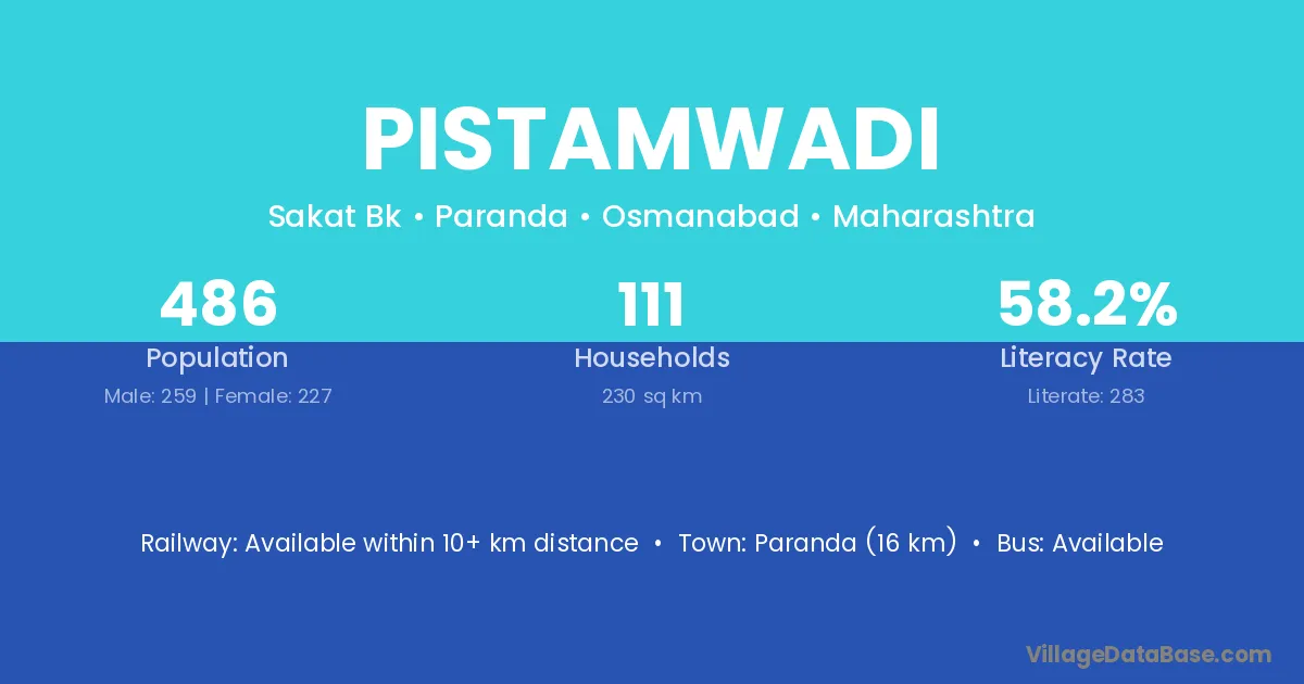 Paranda (16 km) is the nearest town to Pistamwadi village for major economic activities and is located approximately 16 km away.