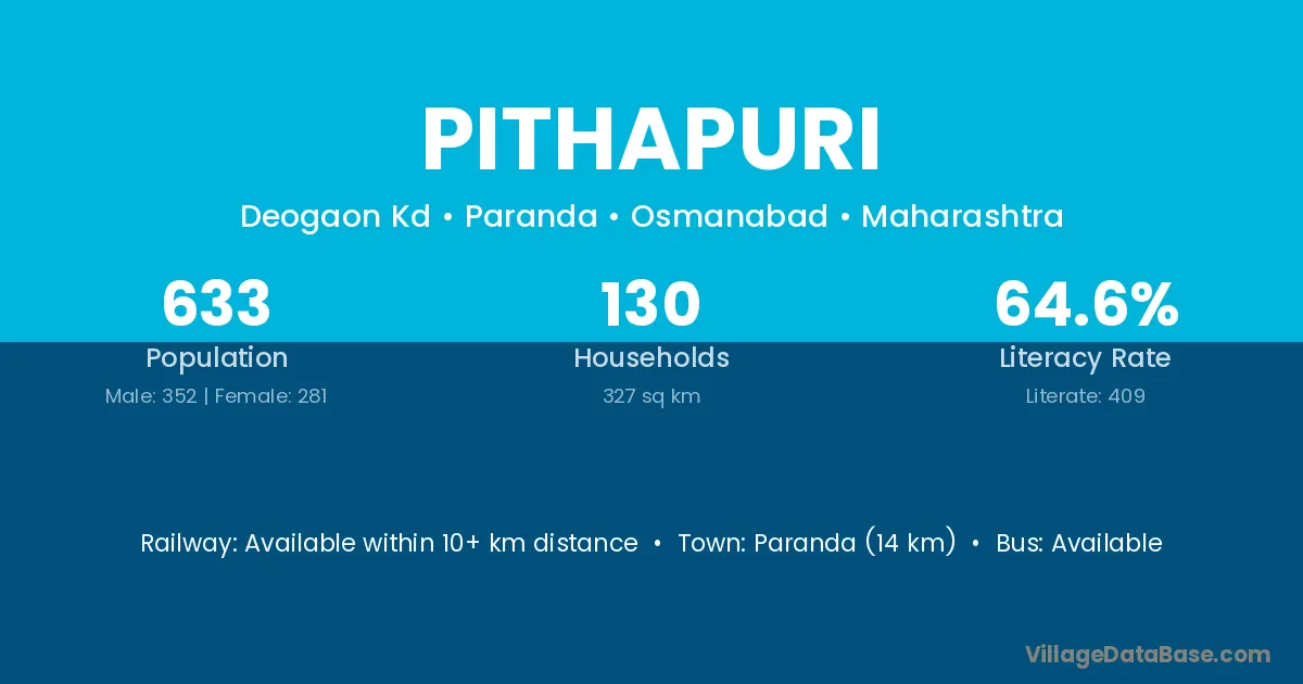 Paranda (14 km) is the nearest town to Pithapuri village for major economic activities and is located approximately 14 km away.